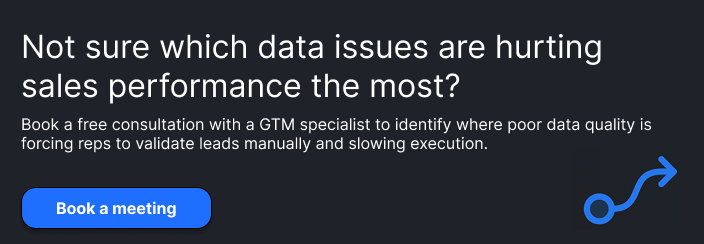 Sales data quality is the accuracy, completeness, and consistency of CRM information used to identify prospects, qualify leads, and forecast deals. Poor sales data quality forces reps to manually validate records instead of selling, breaks segmentation and routing logic, and makes pipeline forecasts unreliable. High-performing teams fix this by enforcing data standards at ingestion, validating data at workflow checkpoints, and treating data integrity as a RevOps architecture problem—not a rep discipline issue.